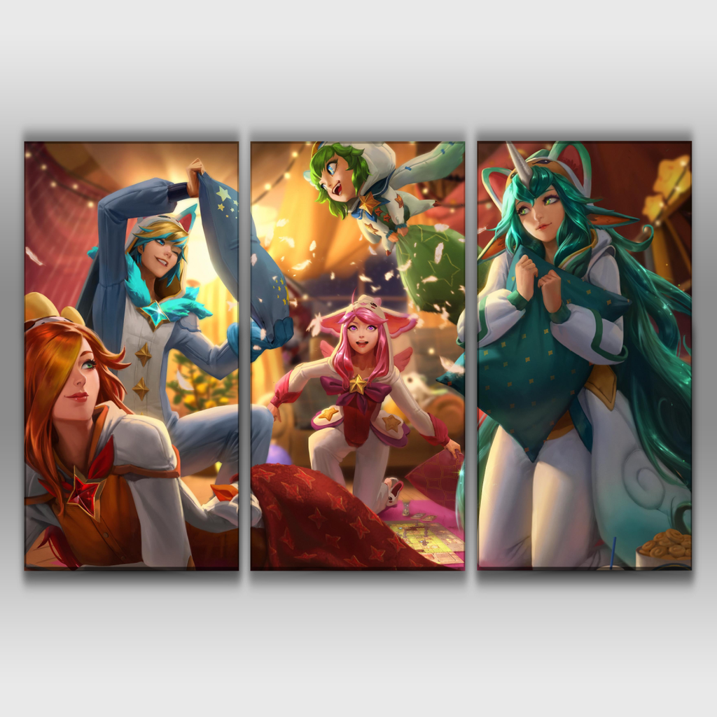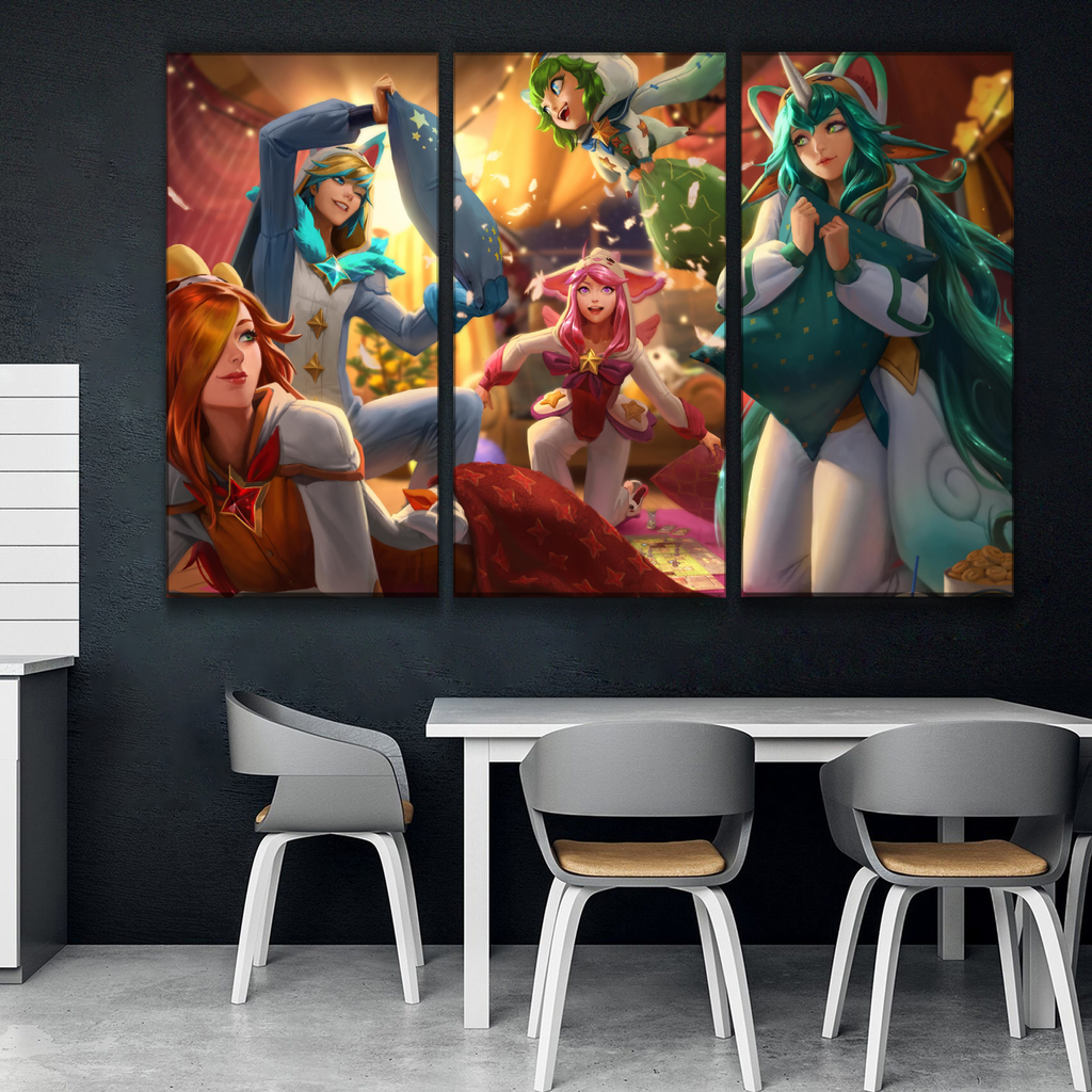 Brand Name: League of Store Type: Canvas Posters Subjects: Pajama Guardian Lux, Soraka, Ezreal, Lulu, and Miss Fortune Frame mode: Framed or Unframed Form: League of Legends online game |